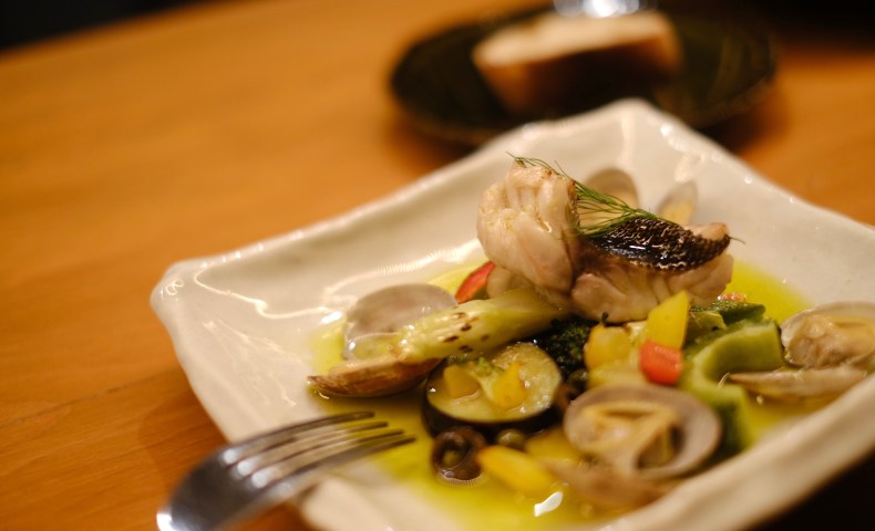 ふっくらとした弾力がたまらないイサキをメインに、アサリ、ズッキーニ、ゴボウ、オクラ、パプリカ、ゴーヤ、オリーブなどの新鮮な野菜が盛りだくさん。