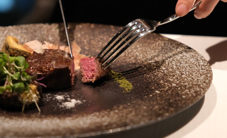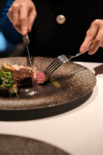表面のみかなり強めに火入れをしたフィレ肉に、最後に合わせるのはその場で剃ったマグロ節…これをソースのように使ってるんですね。