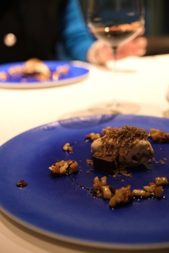 イタリアの海を思わせる青い皿に飾られた秋トリュフをふんだんに使ったアイスはなんとフォアグラ。