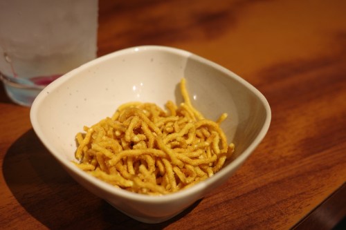 orderは定番の麺を揚げたカリカリしたお通しを食べながら、タッチパネルで。